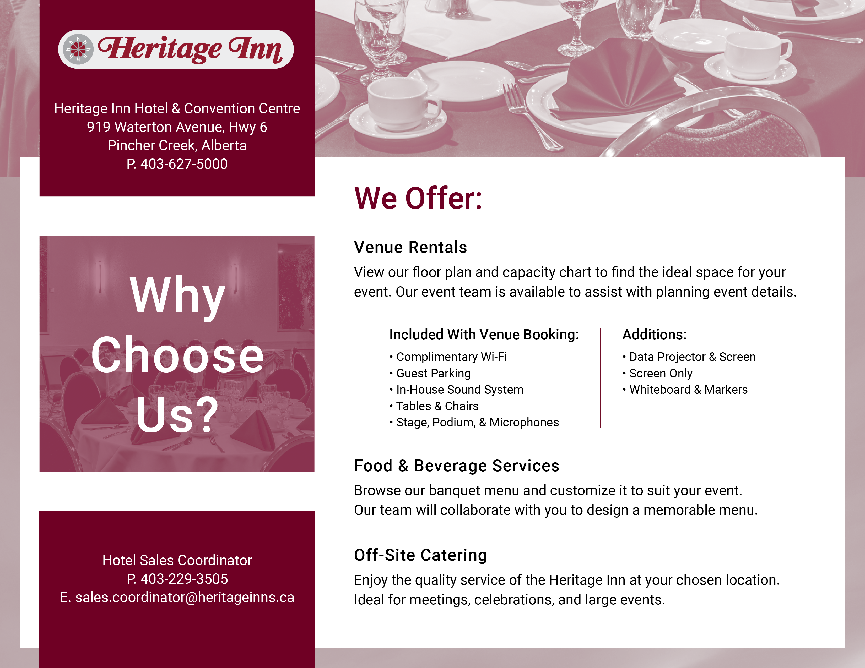 Event Coordinator Contact: sales.coordinator@heritageinns.ca