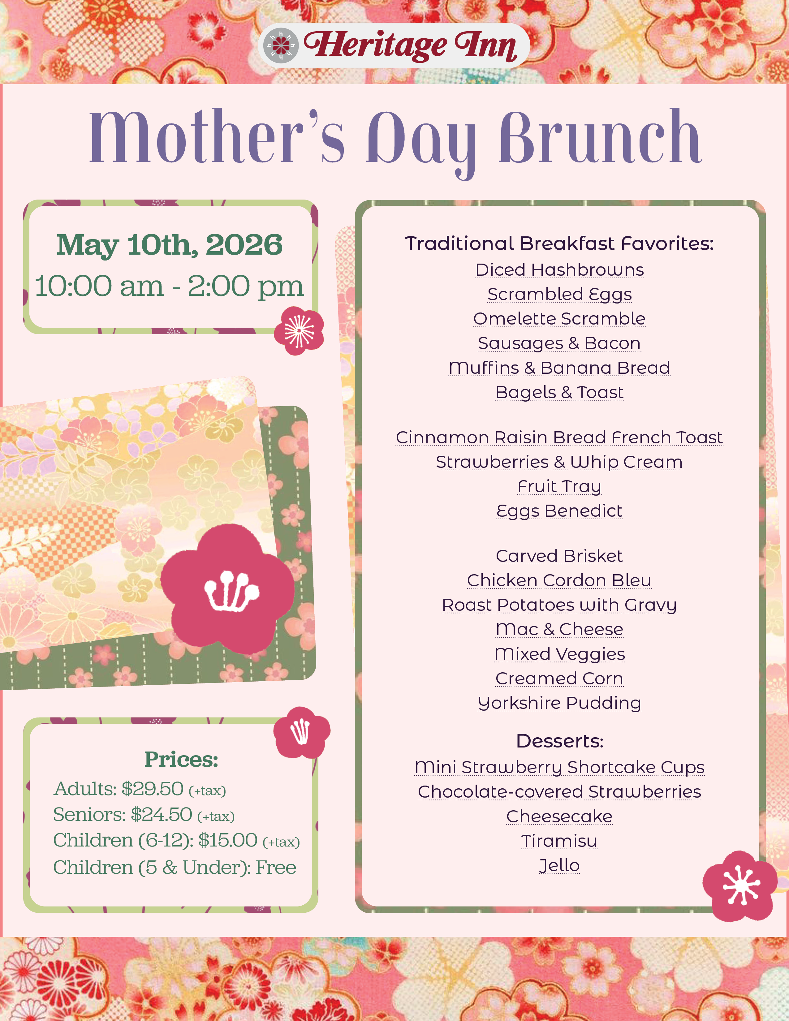 This Mother’s Day, enjoy a delicious brunch buffet featuring classic breakfast favourites like diced hashbrowns, sausages, bacon, and cinnamon raisin French toast. Indulge in savoury highlights including carved brisket, chicken cordon bleu, mac & cheese, and all the comforting sides. Finish on a sweet note with desserts like mini strawberry shortcakes cups, tiramisu, cheesecake, and chocolate covered strawberries. It’s the perfect way to start a special day for Mom.