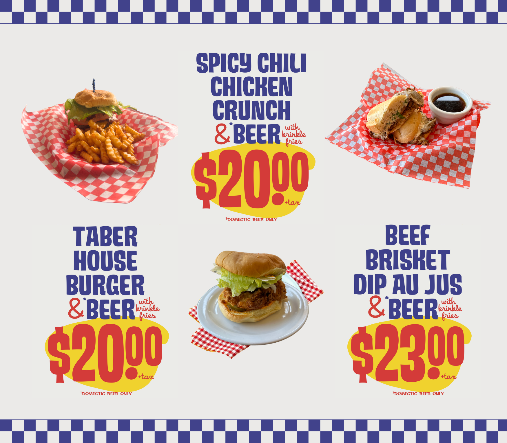 We've got our Taber house burger, spicy chili chicken crunch burger, or our beef brisket with au jus dip to choose from. Every plate is served with a beer and krinkle cut fries because a good meal deserves great company.